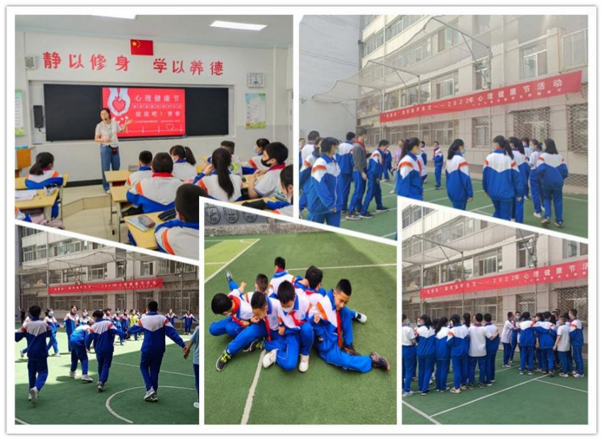青春是充满活力的,在一周内,学生分班级进行了素质拓展活动,有一元五角人民币、巧解手链、坐地起身。心理老师先在班级为学生讲解规则,然后在操场开展活动,各班级井然有序地进行着,有十几个人的坐地起身,全班人的巧解手链,学生们不断尝试,不断改进,处处洋溢着一种奋发拼搏,勇于争先、合作进取的精神,这不正是青春的色彩吗?