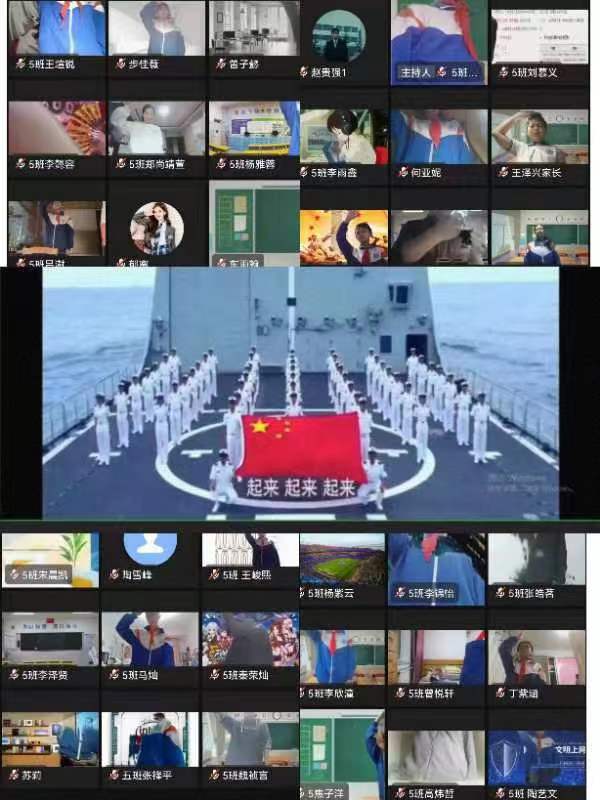 上午7:30,各班级通过班级钉钉群视频会议,播放升旗视频,举行云端升旗仪式。各位同学着校服装,戴红领巾,面向国旗,庄严肃立,敬队礼,升国旗,唱国歌。